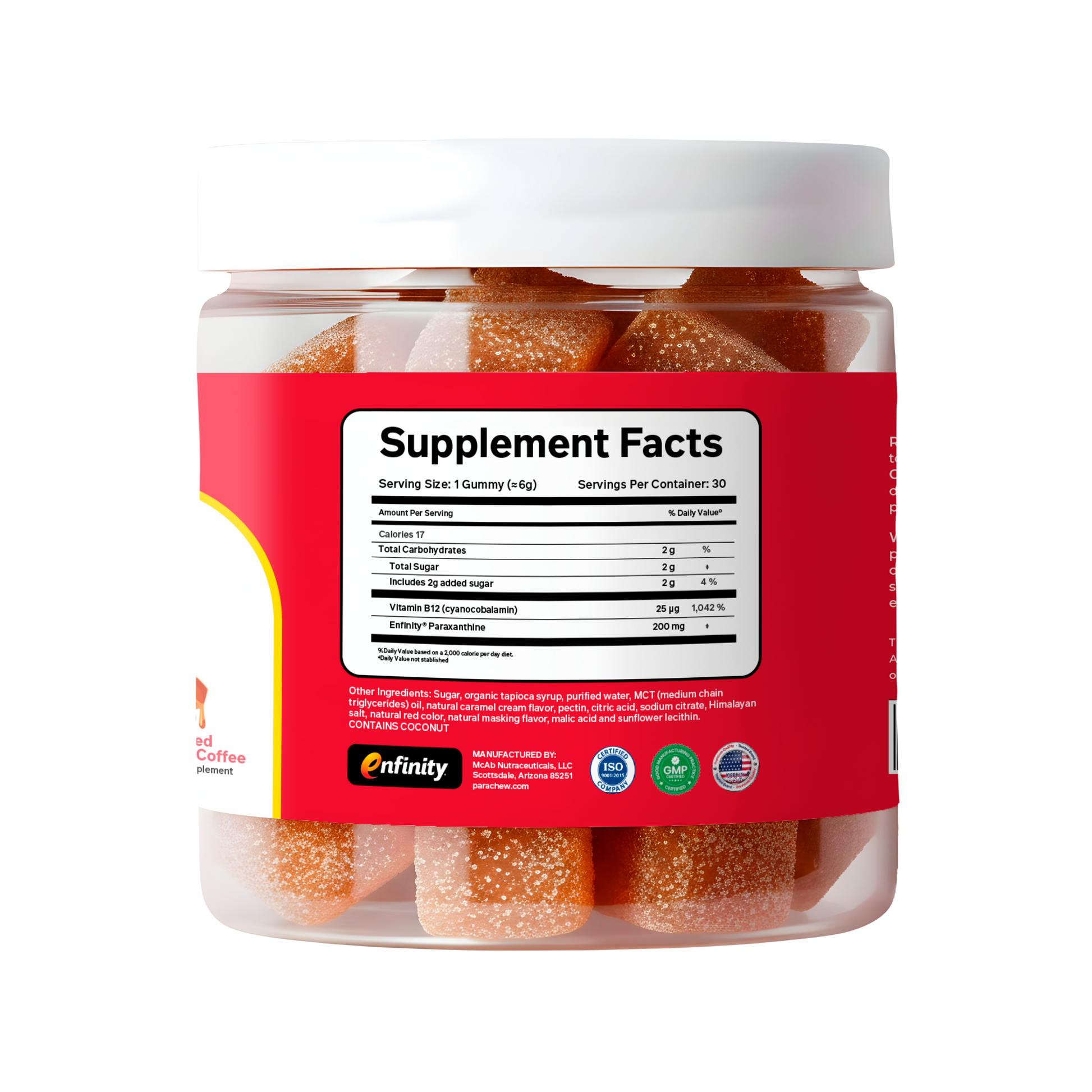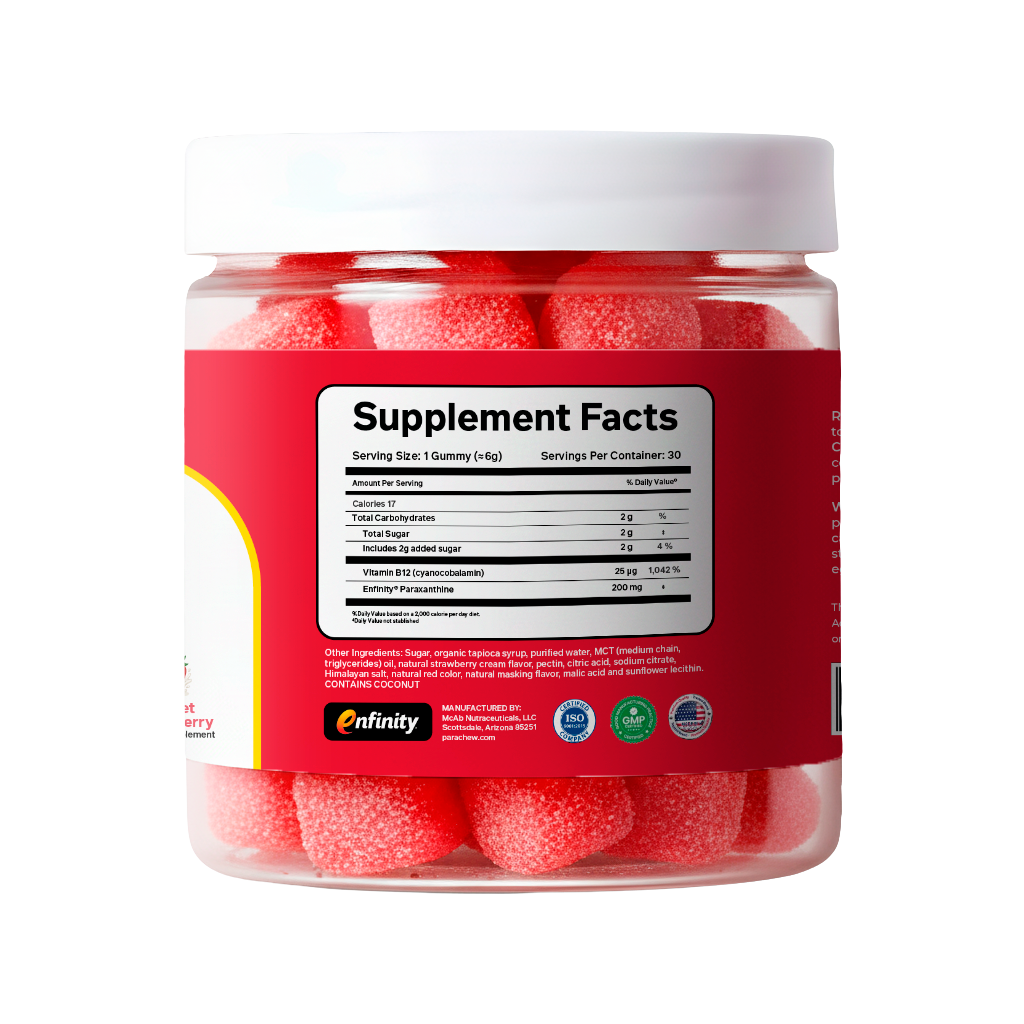 enfinity® is the patented, clinically studied form of paraxanthine used in Parachew. It's the same form of paraxanthine used in published human clinical trials, ensuring consistency, purity, and efficacy in every gummy.